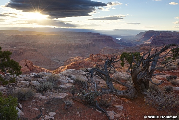 • Description:  Desert juniper tree with red rock and sunburst through clouds near Lake Powell, Southern Utah