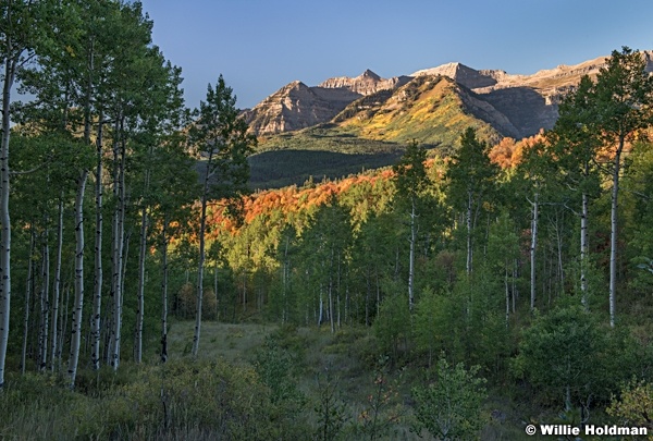 • Description:  Timpanogos at the start of autumn with straight green aspen grove